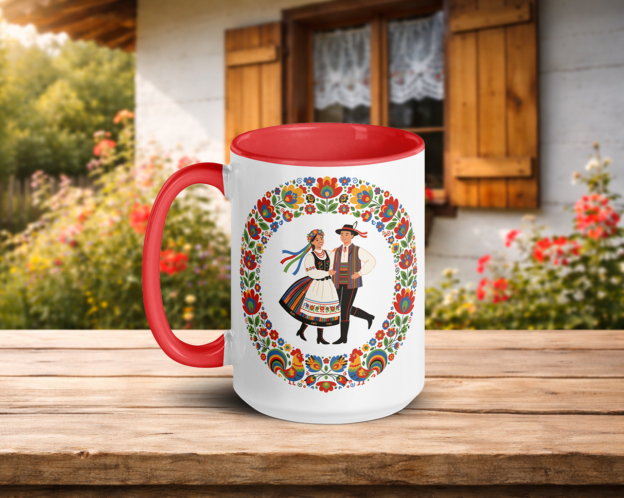 This ceramic mug features a joyful Polish folk couple dancing in traditional regional costumes, framed by vibrant floral patterns. The artwork is printed on two sides, creating a balanced and decorative presentation. Colored rim, interior, and handle add a lively accent that complements the folk design. A cheerful everyday mug for coffee or tea, inspired by tradition and celebration.