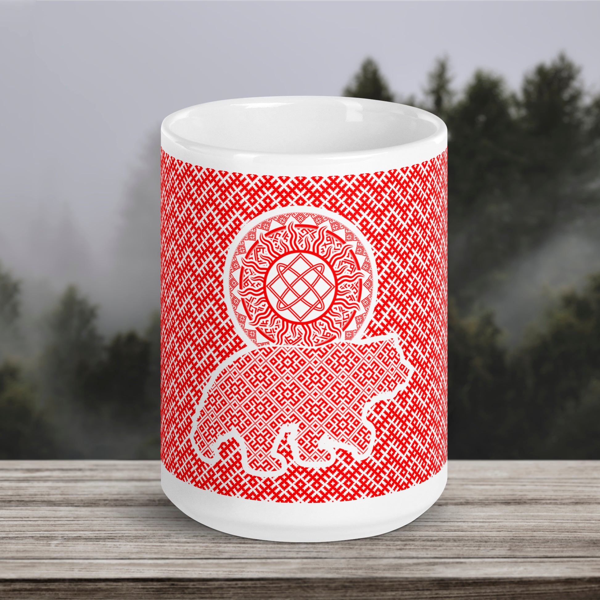 A minimalist design featuring a bear and a Slavic-inspired solar symbol. The sun motif represents strength, life cycles, and protection. Bold red and black create a strong visual contrast rooted in folk geometry. A clean, heritage-inspired statement for everyday use.