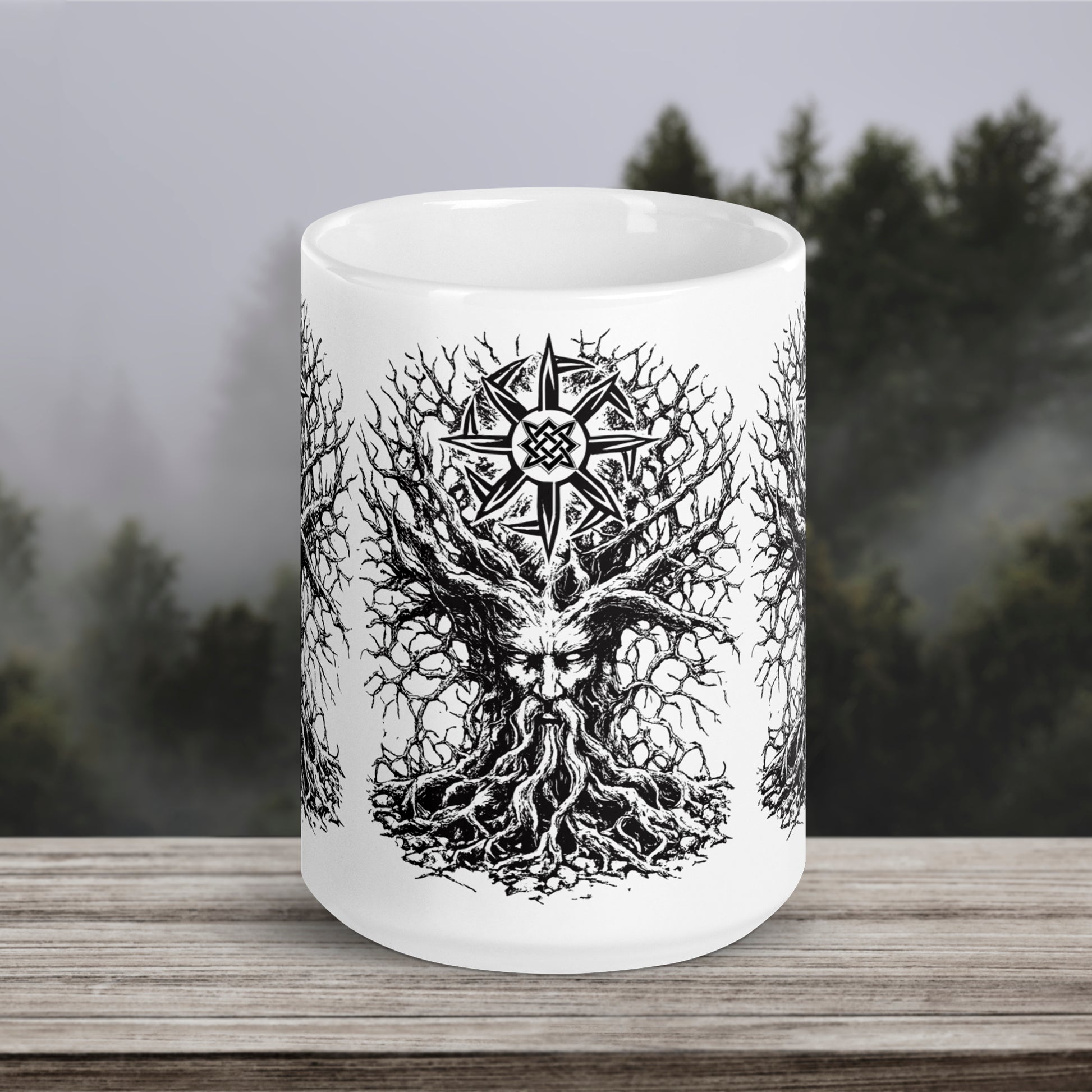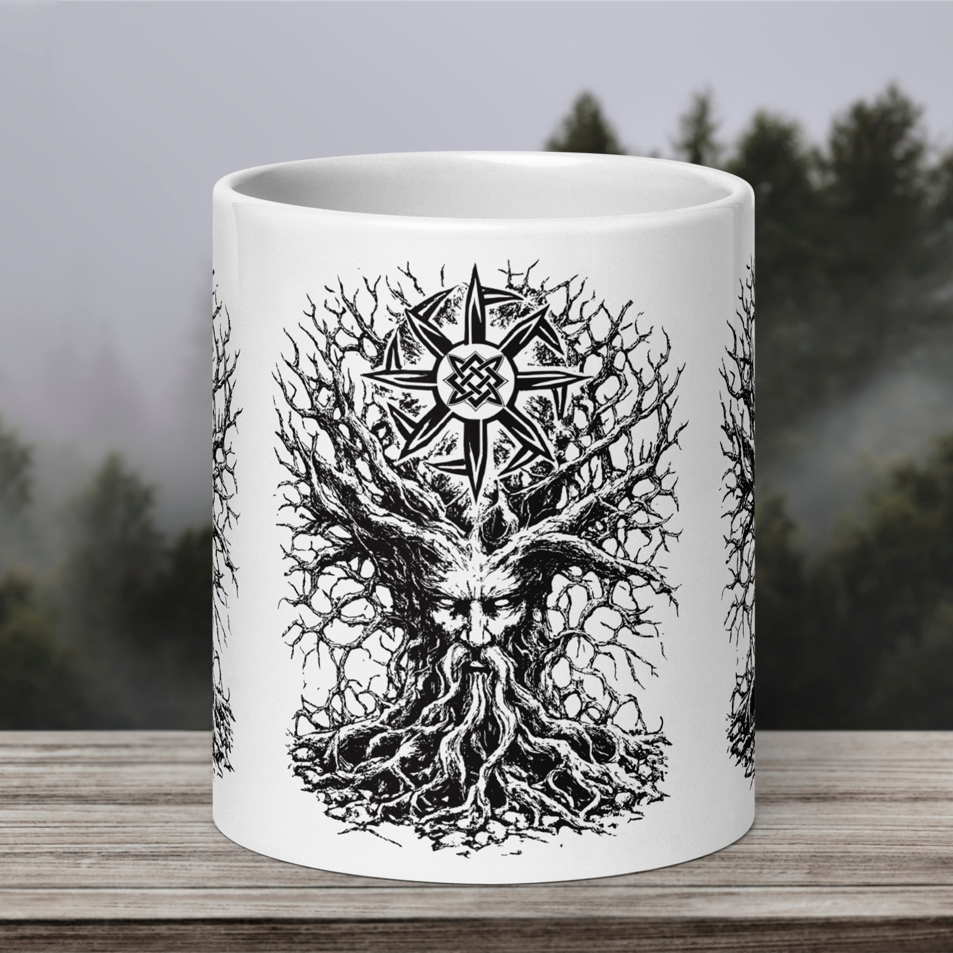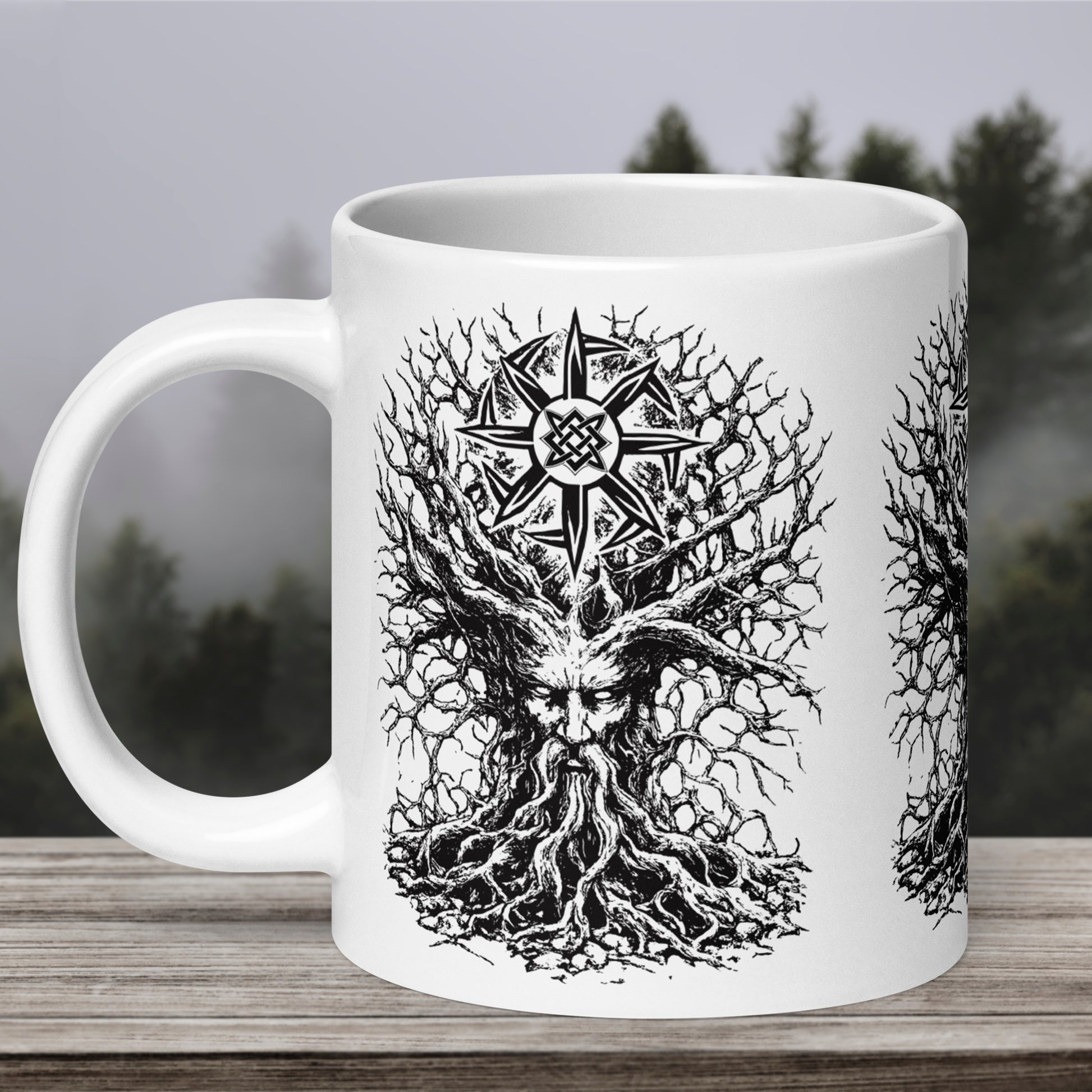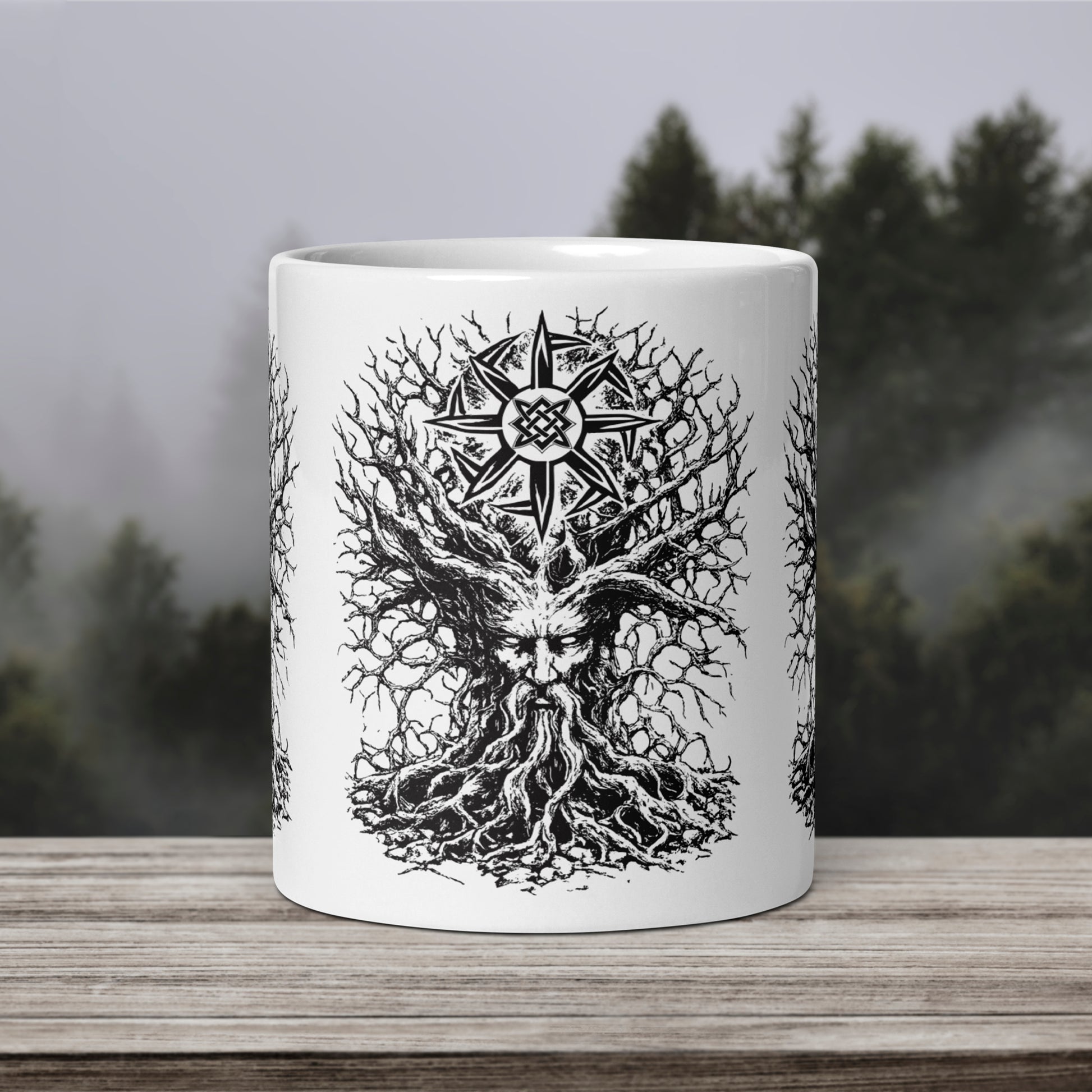 A dark, minimalist design inspired by Slavic mythology, featuring a symbolic tree form beneath a radiant solar emblem. The tree represents life, roots, and the connection between worlds, while the solar symbol evokes cosmic fire and creative force. Black-on-black detailing gives the artwork a subtle yet powerful presence. A bold myth-inspired piece with a modern edge.